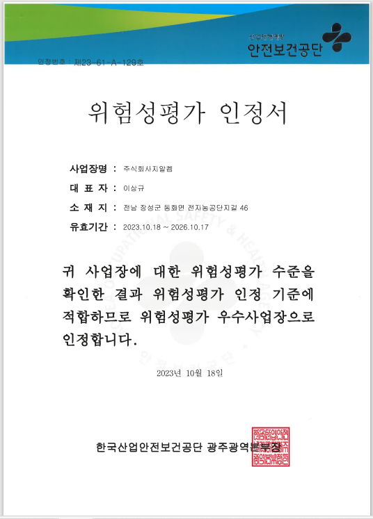 (주) 지알켐의 위험성평가 우수사업장 인정